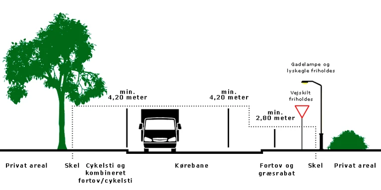 - Minimum højde 4,20 m over cykelsti/kombineret fortov og cykelsti/kørebane.